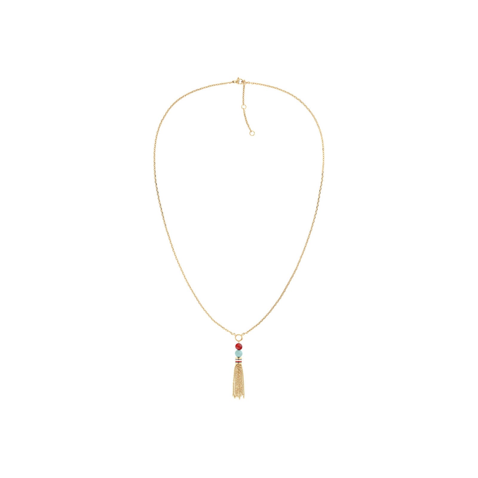 Γυναικείο κολιέ της Tommy Hilfiger από ανοξείδωτο ατσάλι σε χρυσό χρώμα με κόκκινη και γαλάζια πέτρα και κρόσσια στο τελείωμα. Το κούμπωμα της αλυσίδας είναι από ανοξείδωτο ατσάλι και είναι ασφαλείας. Το κολιέ κουμπώνει στους 65 πόντους, με δυνατότητα και στους 63 και 60.