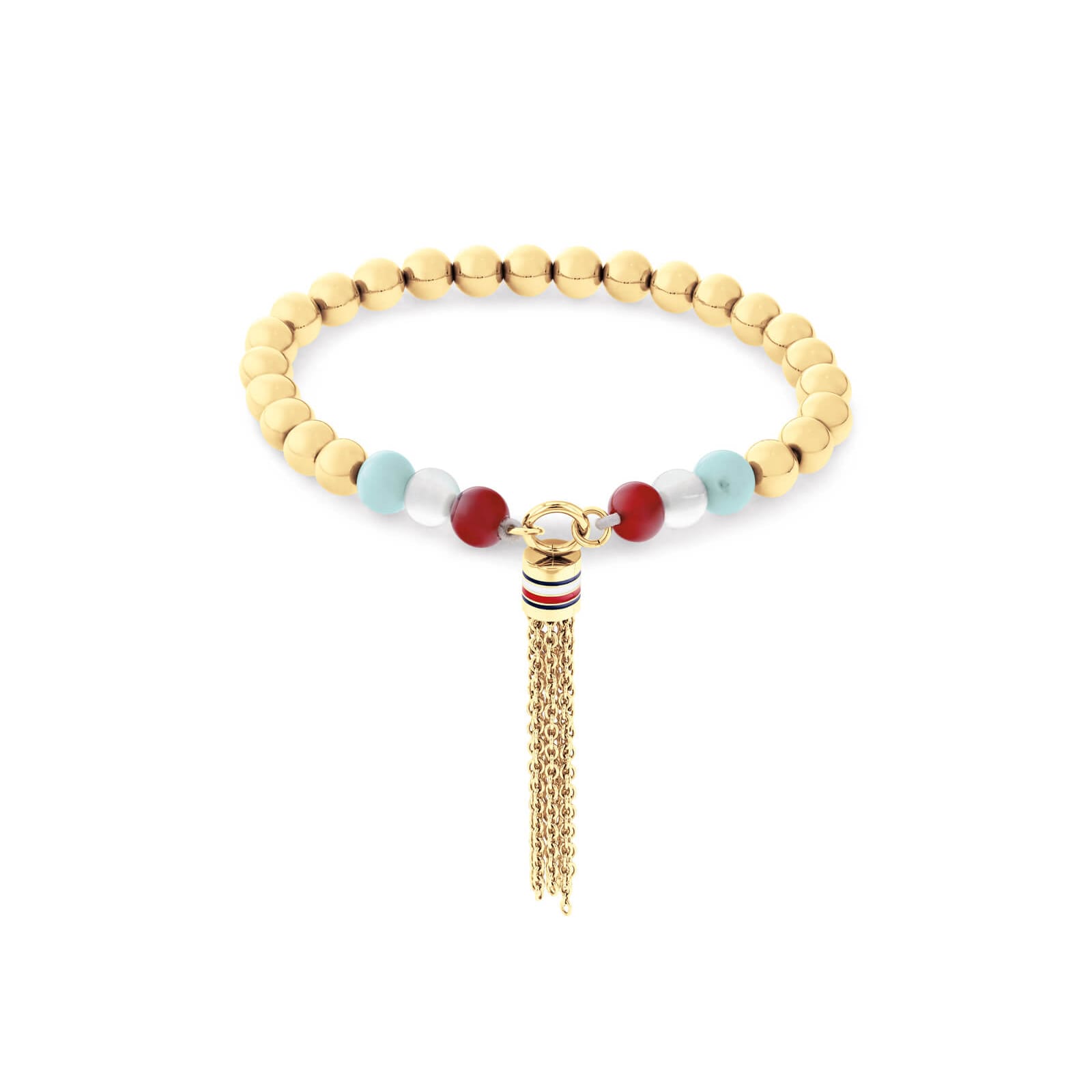 Γυναικείο βραχιόλι της Tommy Hilfiger από ανοξείδωτο ατσάλι σε χρυσό χρώμα με κόκκινες, λευκές και γαλάζιες πέτρες και κρόσσια στο τελείωμα. Το βραχιόλι είναι ελαστικό.