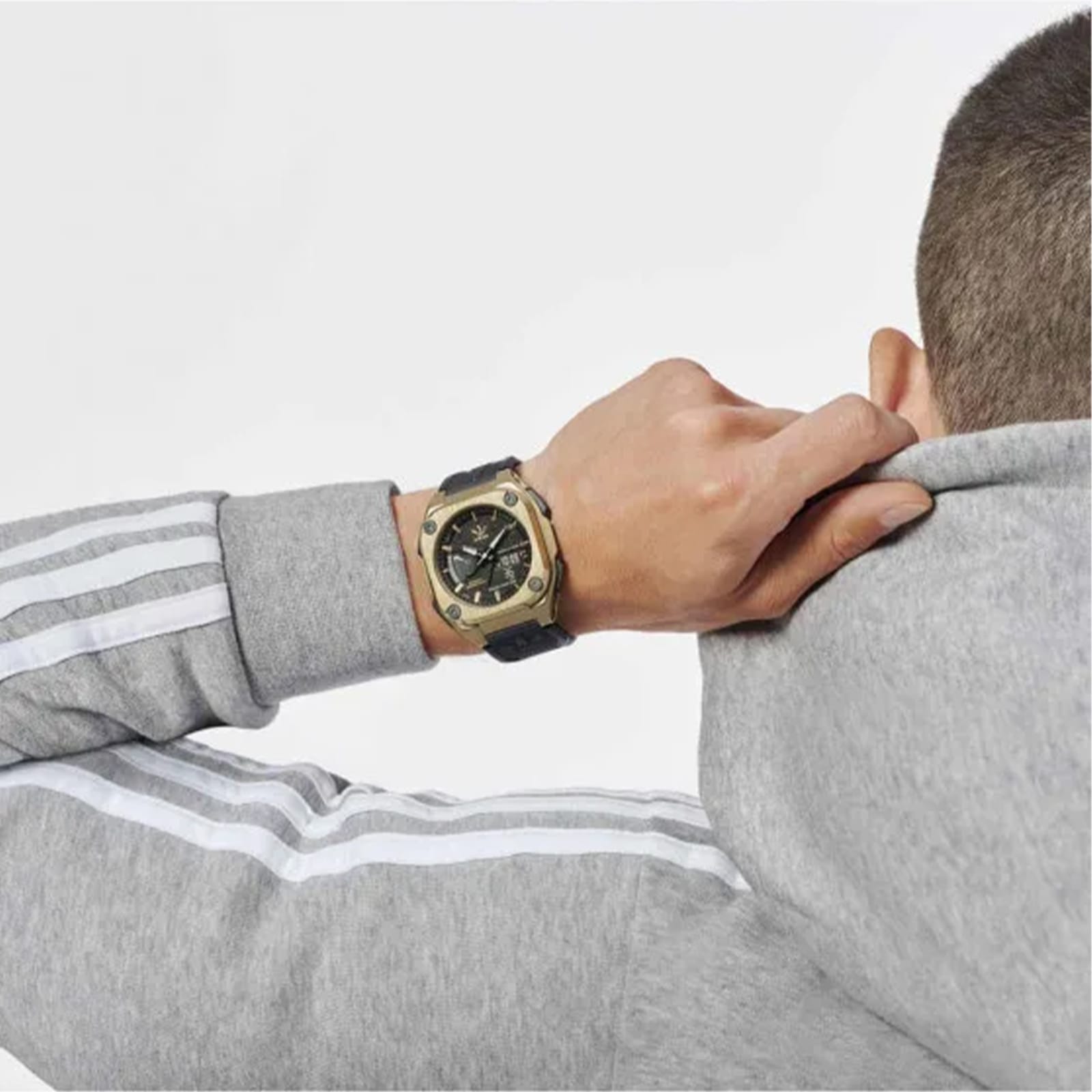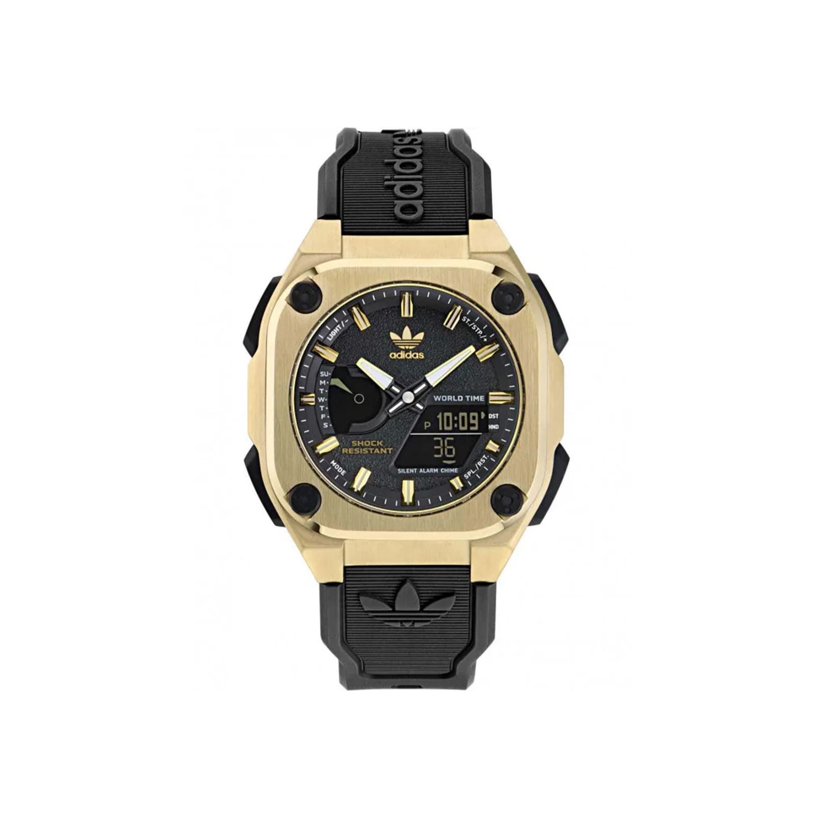 Ανδρικό ρολόι Adidas από ανοξείδωτο ατσάλι με λουρί από καουτσούκ σε μαύρο χρώμα και μαύρο καντράν με χρυσή κάσα. Το ρολόι διαθέτει ορυκτό κρύσταλλο ειδικής σκλήρυνσης και μηχανισμό quartz με αναλογική ώρα και ψηφιακές ενδείξεις ώρας, ημέρας, ημερομηνίας, χρονογράφων και ξυπνητηριού.