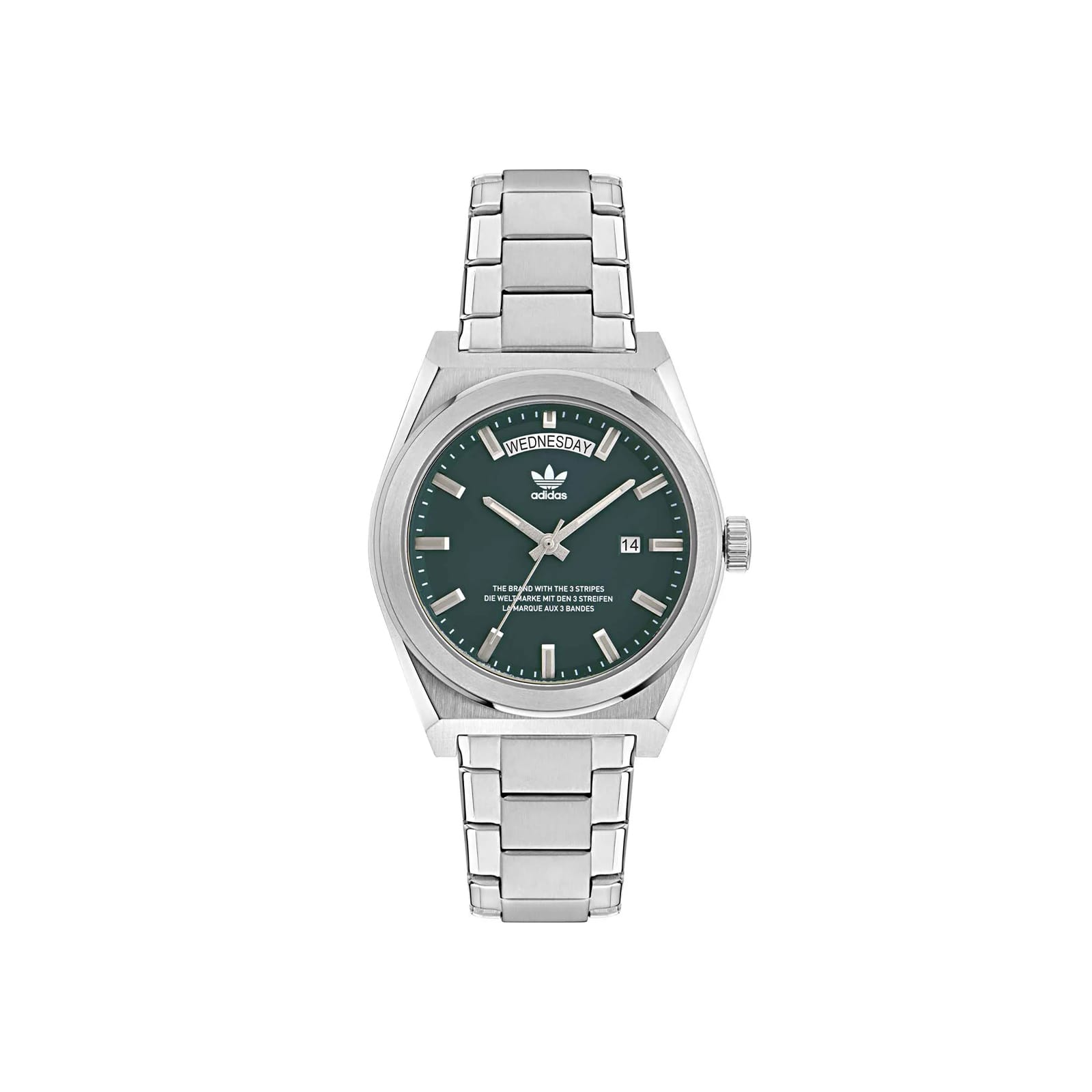 Ανδρικό ρολόι Adidas από ανοξείδωτο ατσάλι με μπρασελέ σε ασημί χρώμα και σκούρο πράσινο καντράν με ένδειξη της ημερομηνίας και της ημέρας. Το ρολόι διαθέτει ορυκτό κρύσταλλο ειδικής σκλήρυνσης και μηχανισμό quartz.