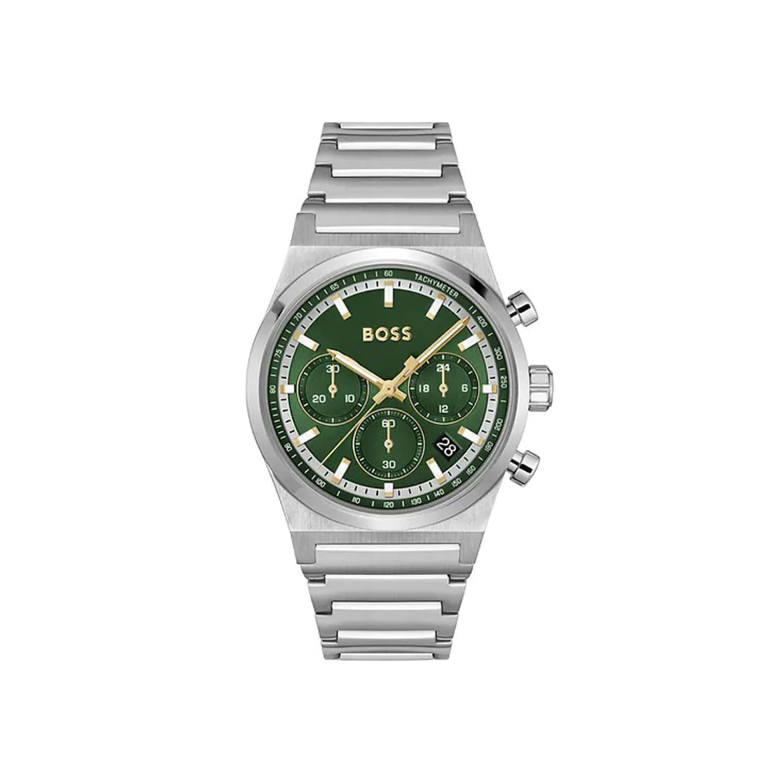 Ανδρικό ρολόι Boss από ανοξείδωτο ατσάλι με ασημί μπρασελέ και πράσινο καντράν με ένδειξη της ημερομηνίας και χρονογράφους. Το ρολόι διαθέτει ορυκτό κρύσταλλο ειδικής σκλήρυνσης και μηχανισμό quartz.