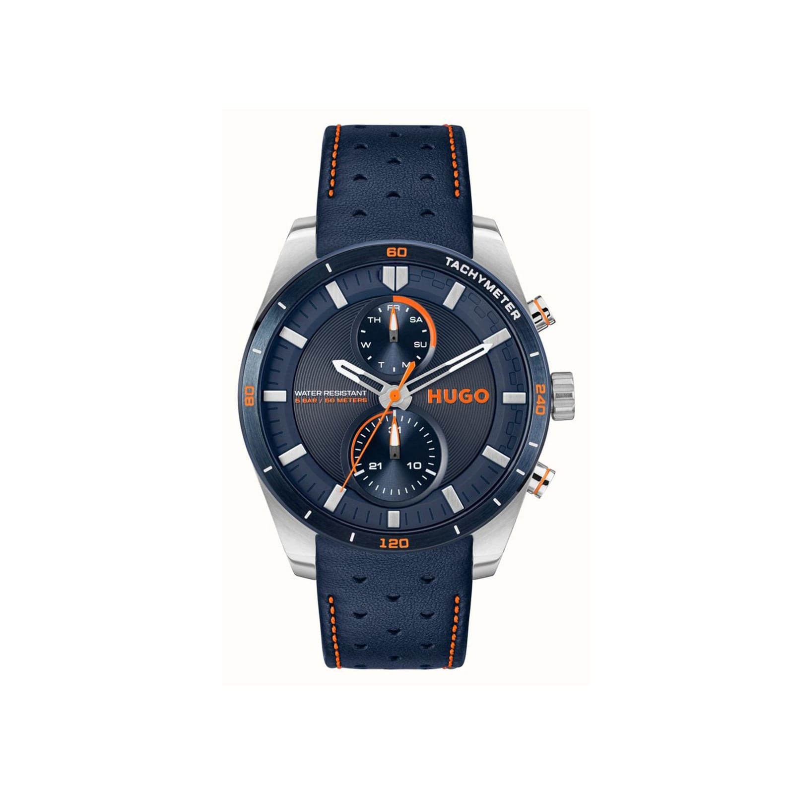 Ανδρικό ρολόι Hugo Boss από ανοξείδωτο ατσάλι, μπλε σκούρο καντράν με χρονογράφους και πορτοκαλί λεπτομέρειες και μπλε σκούρο δερμάτινο λουράκι. Το ρολόι διαθέτει ένδειξη ημερομηνίας και ημέρας της εβδομάδας, οργανικό κρύσταλλο και quartz μηχανισμό.