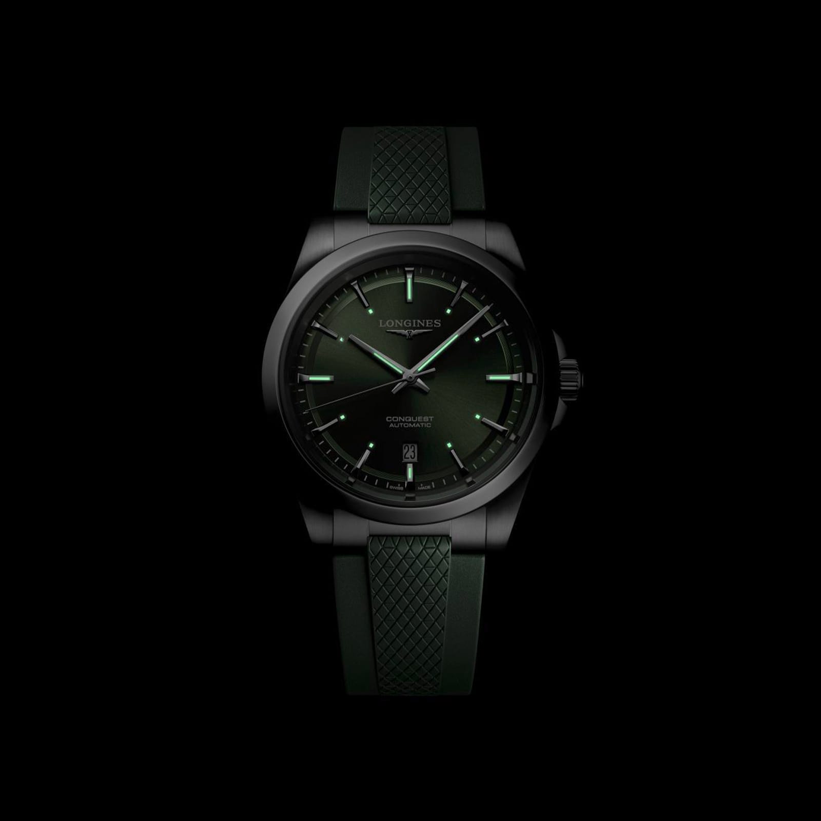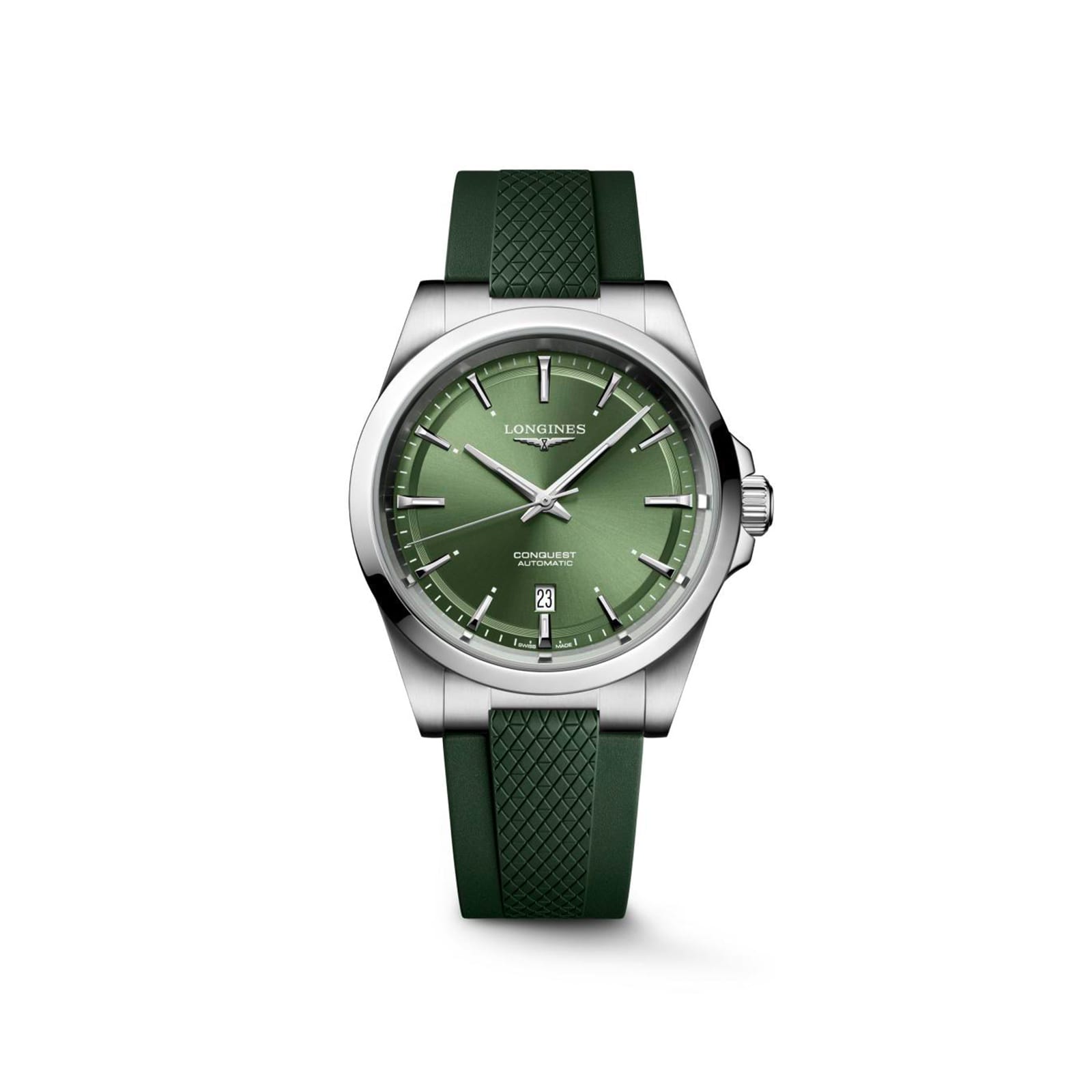 Ανδρικό ρολόι Longines της σειράς Conquest με λουρί από καουτσούκ σε πράσινο χρώμα, με sunray πράσινο καντράν και ένδειξη της ημερομηνίας, αυτόματο μηχανισμό κουρδίσματος που εκτελεί 25’200 ταλαντώσεις ανά ώρα, με απόθεμα ισχύος περίπου 72 ώρες και αχάρακτο κρύσταλλο ζαφειρίου και βιδωτή κορώνα. Η συλλογή Conquest έχει εξελιχθεί μέσω σχεδιασμού και τεχνολογίας, αλλά έχει παραμείνει πιστή στην αρχική της ταυτότητα, αποπνέοντας ένα αρμονικό μείγμα σύγχρονου σχεδιασμού και αθλητικής κομψότητας. Κάθε ρολόι Conquest αναδεικνύει την ακλόνητη δέσμευση της Longines στην απόδοση και την τελειότητα στην ωρολογοποιία. Με τα ευέλικτα μοντέλα του, το Conquest αποτελεί απόδειξη της αφοσίωσης της Longines στη δημιουργία ρολογιών για κάθε πτυχή της ζωής.