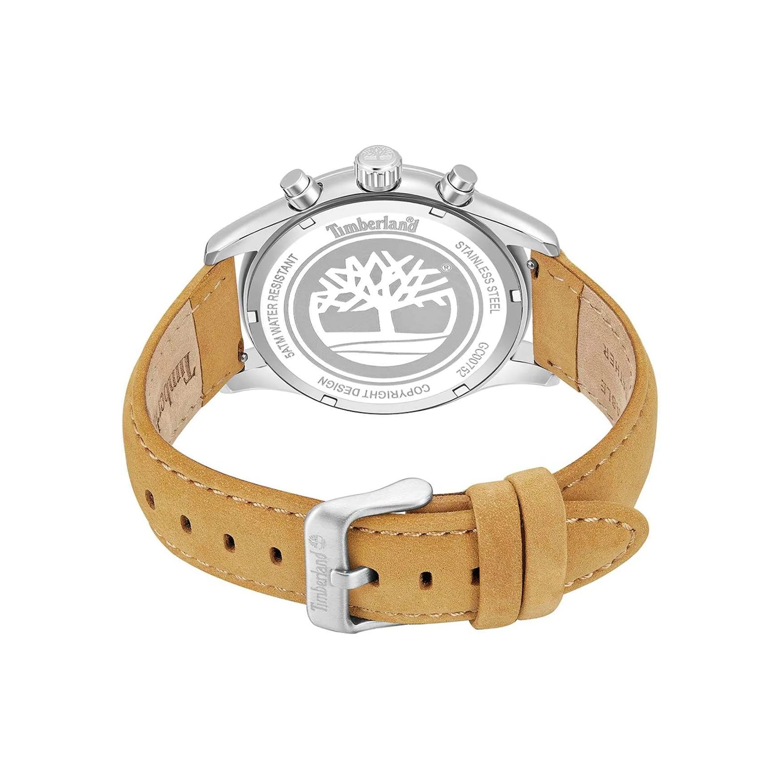 Ανδρικό ρολόι Timberland από ανοξείδωτο ατσάλι με λουρί από δέρμα σε καφέ χρώμα, ασημί κάσα και μπεζ καντράν με το λογότυπο της εταιρείας, χρονογράφους και ένδειξη ημερομηνίας. Το ρολόι διαθέτει ορυκτό κρύσταλλο ειδικής σκλήρυνσης και μηχανισμό quartz.