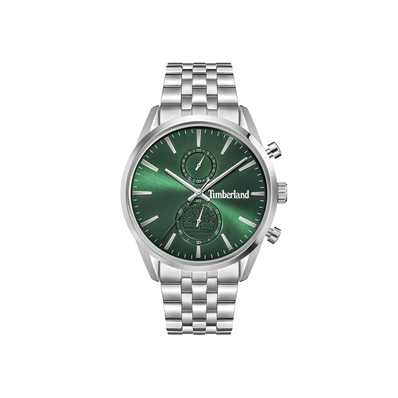 Ανδρικό ρολόι Timberland από ανοξείδωτο ατσάλι με μπρασελέ σε ασημί χρώμα, ασημί κάσα και πράσινο καντράν με το λογότυπο της εταιρείας και χρονογράφους. Το ρολόι διαθέτει ορυκτό κρύσταλλο ειδικής σκλήρυνσης και μηχανισμό quartz.