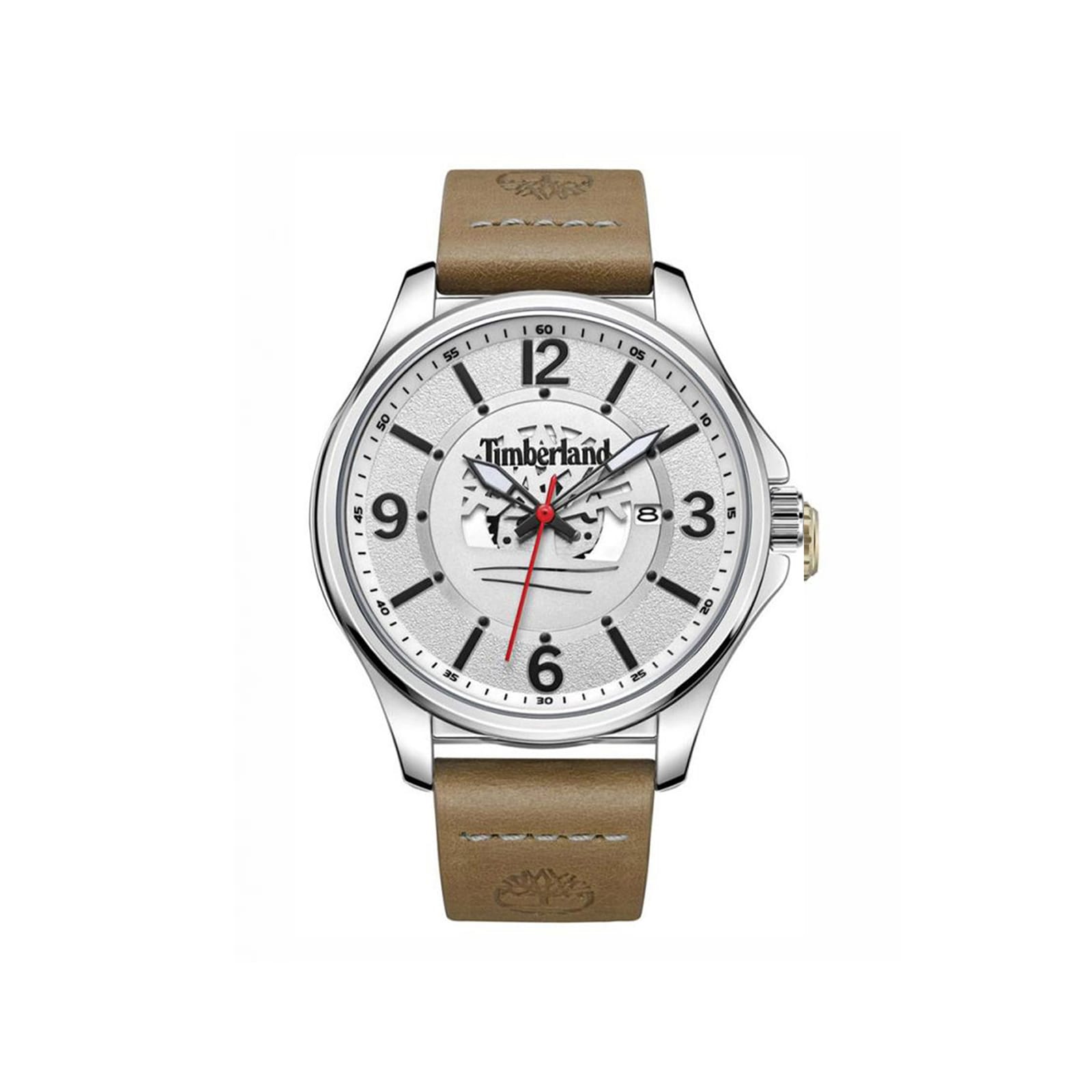 Ανδρικό ρολόι Timberland από ανοξείδωτο ατσάλι με λουρί από δέρμα σε καφέ χρώμα, ασημί κάσα και λευκό καντράν με το λογότυπο της εταιρείας και ένδειξη της ημερομηνίας. Το ρολόι διαθέτει ορυκτό κρύσταλλο ειδικής σκλήρυνσης και μηχανισμό quartz.