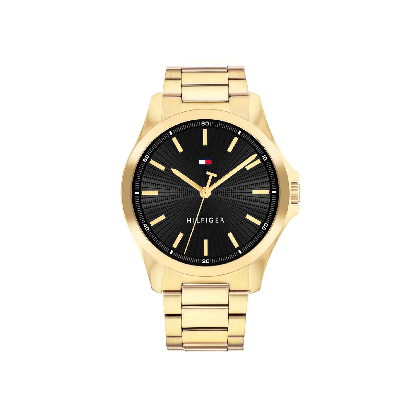 Ανδρικό ρολόι Tommy Hilfiger με μπρασελέ από ανοξείδωτο ατσάλι σε χρυσό χρώμα και μαύρο καντράν. Το ρολόι διαθέτει ορυκτό κρύσταλλο ειδικής σκλήρυνσης και μηχανισμό quartz.