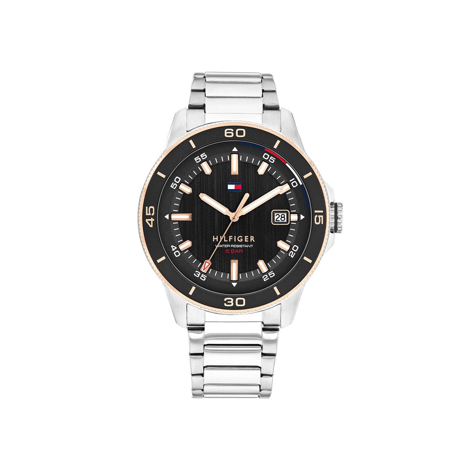 Ανδρικό ρολόι Tommy Hilfiger με μπρασελέ από ανοξείδωτο ατσάλι σε ασημί χρώμα και μαύρο καντράν με ροζ χρυσές λεπτομέρειες και ένδειξη της ημερομηνίας . Το ρολόι διαθέτει ορυκτό κρύσταλλο ειδικής σκλήρυνσης και μηχανισμό quartz.