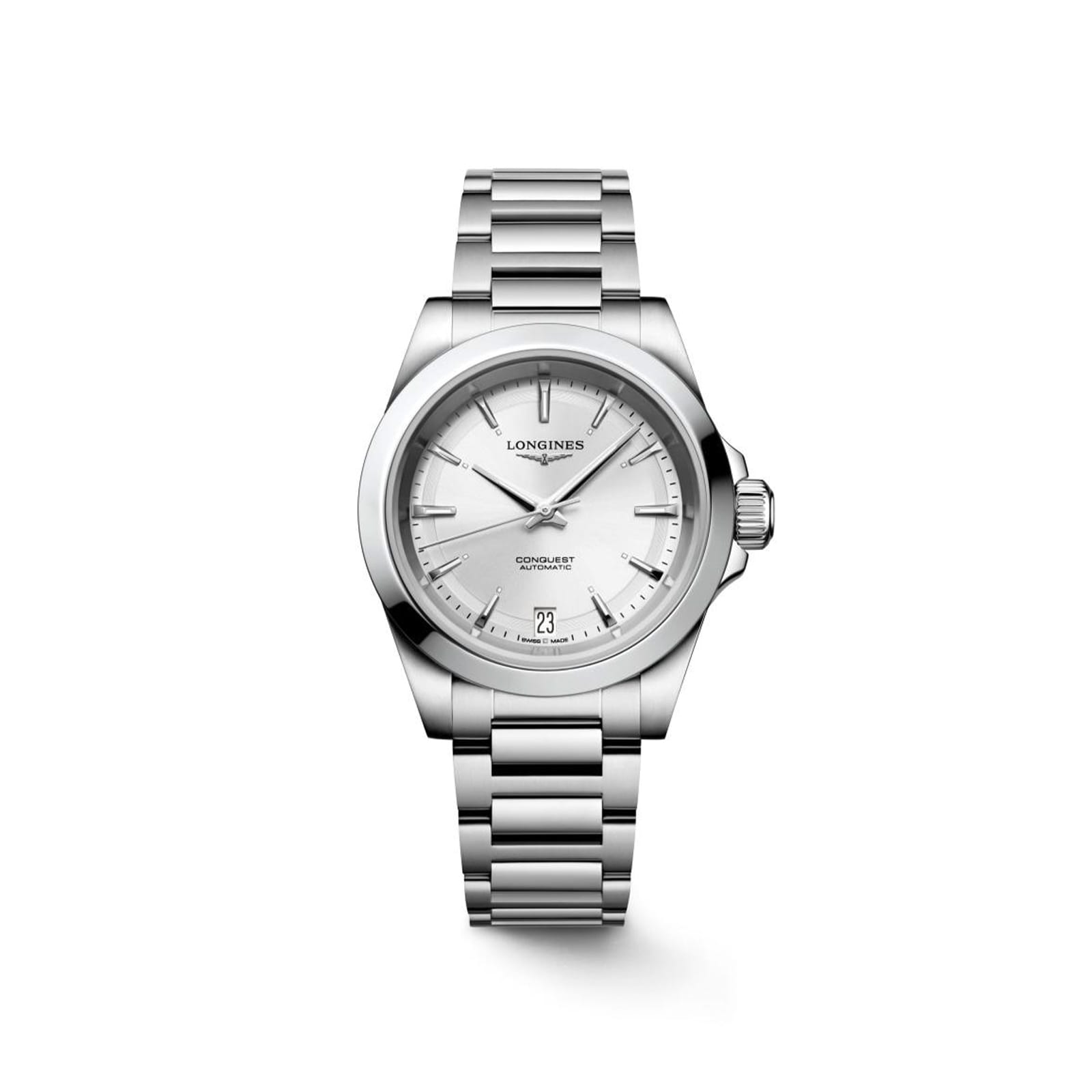 Γυναικείο ρολόι Longines της σειράς Conquest με μπρασελέ από ανοξείδωτο ατσάλι, με sunray ασημί καντράν και ένδειξη της ημερομηνίας, αυτόματο μηχανισμό κουρδίσματος που εκτελεί 25’200 ταλαντώσεις ανά ώρα, με απόθεμα ισχύος περίπου 72 ώρες και αχάρακτο κρύσταλλο ζαφειρίου και βιδωτή κορώνα. Η συλλογή Conquest έχει εξελιχθεί μέσω σχεδιασμού και τεχνολογίας, αλλά έχει παραμείνει πιστή στην αρχική της ταυτότητα, αποπνέοντας ένα αρμονικό μείγμα σύγχρονου σχεδιασμού και αθλητικής κομψότητας. Κάθε ρολόι Conquest αναδεικνύει την ακλόνητη δέσμευση της Longines στην απόδοση και την τελειότητα στην ωρολογοποιία. Με τα ευέλικτα μοντέλα του, το Conquest αποτελεί απόδειξη της αφοσίωσης της Longines στη δημιουργία ρολογιών για κάθε πτυχή της ζωής.