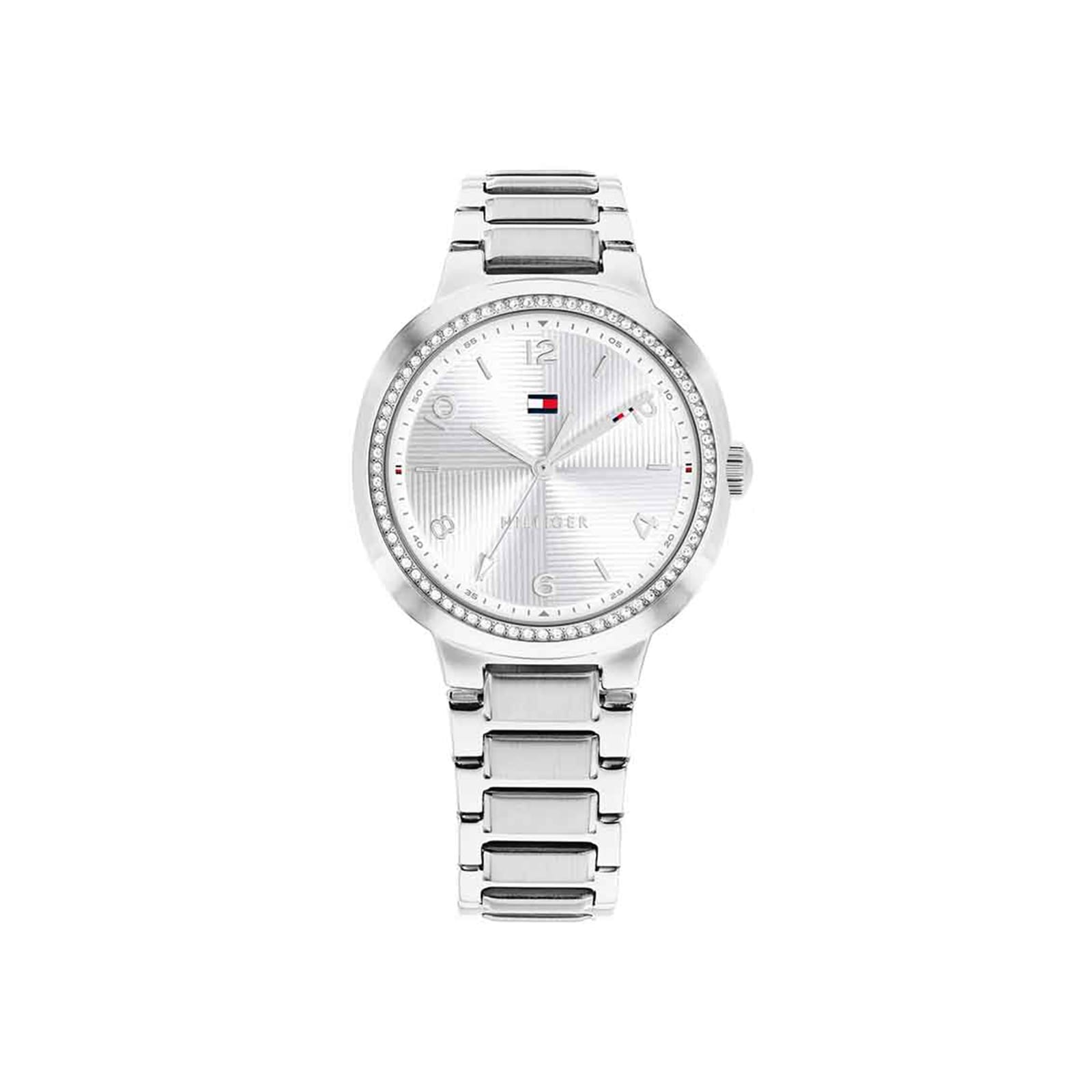 Γυναικείο ρολόι Tommy Hilfiger με μπρασελέ σε ασημί χρώμα από ανοξείδωτο ατσάλι και λευκό καντράν με πέτρες ζιρκόν. Το ρολόι διαθέτει ορυκτό κρύσταλλο ειδικής σκλήρυνσης και μηχανισμό quartz.