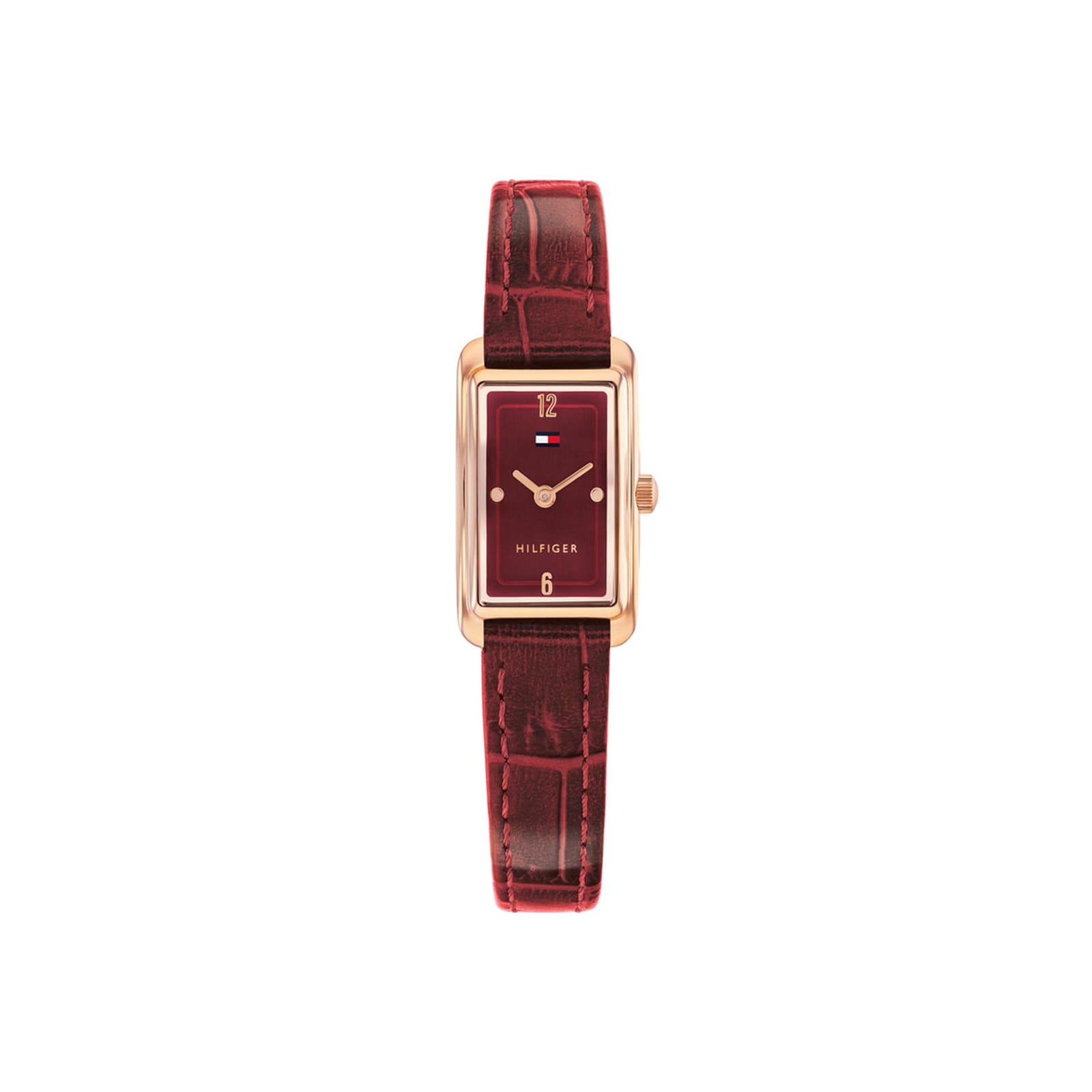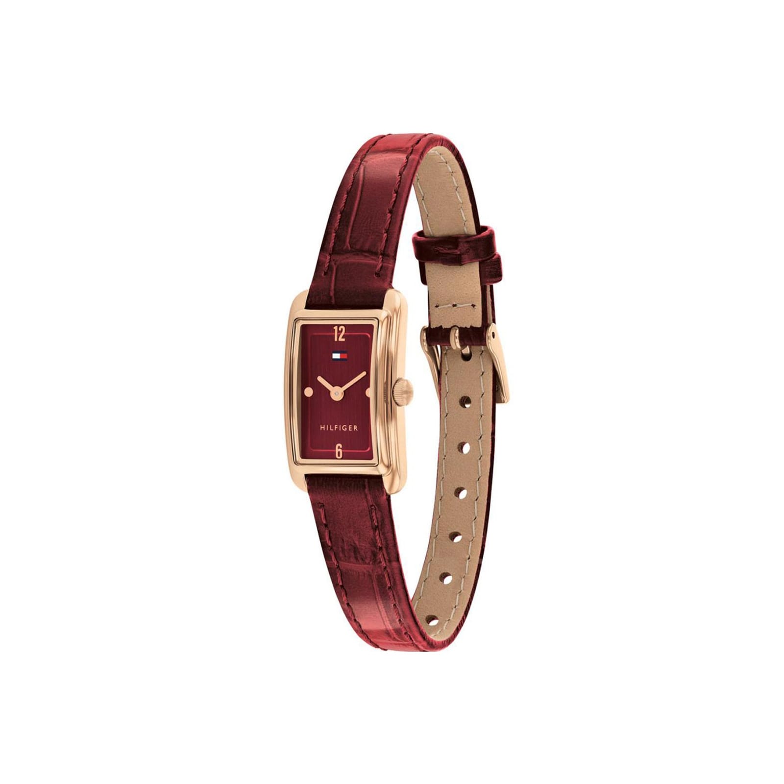 Γυναικείο ρολόι Tommy Hilfiger σε ορθογώνιο σχήμα, με σκούρο κόκκινο δερμάτινο λουράκι και σκούρο κόκκινο καντράν. Το ρολόι διαθέτει ορυκτό κρύσταλλο ειδικής σκλήρυνσης και μηχανισμό quartz.