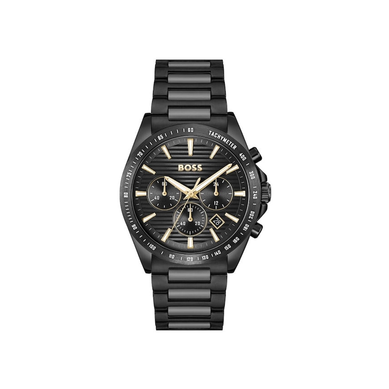 Ανδρικό ρολόι Boss από ανοξείδωτο ατσάλι με μαύρο μπρασελέ και μαύρο καντράν με ένδειξη της ημερομηνίας και χρονογράφους. Το ρολόι διαθέτει ορυκτό κρύσταλλο ειδικής σκλήρυνσης και μηχανισμό quartz.