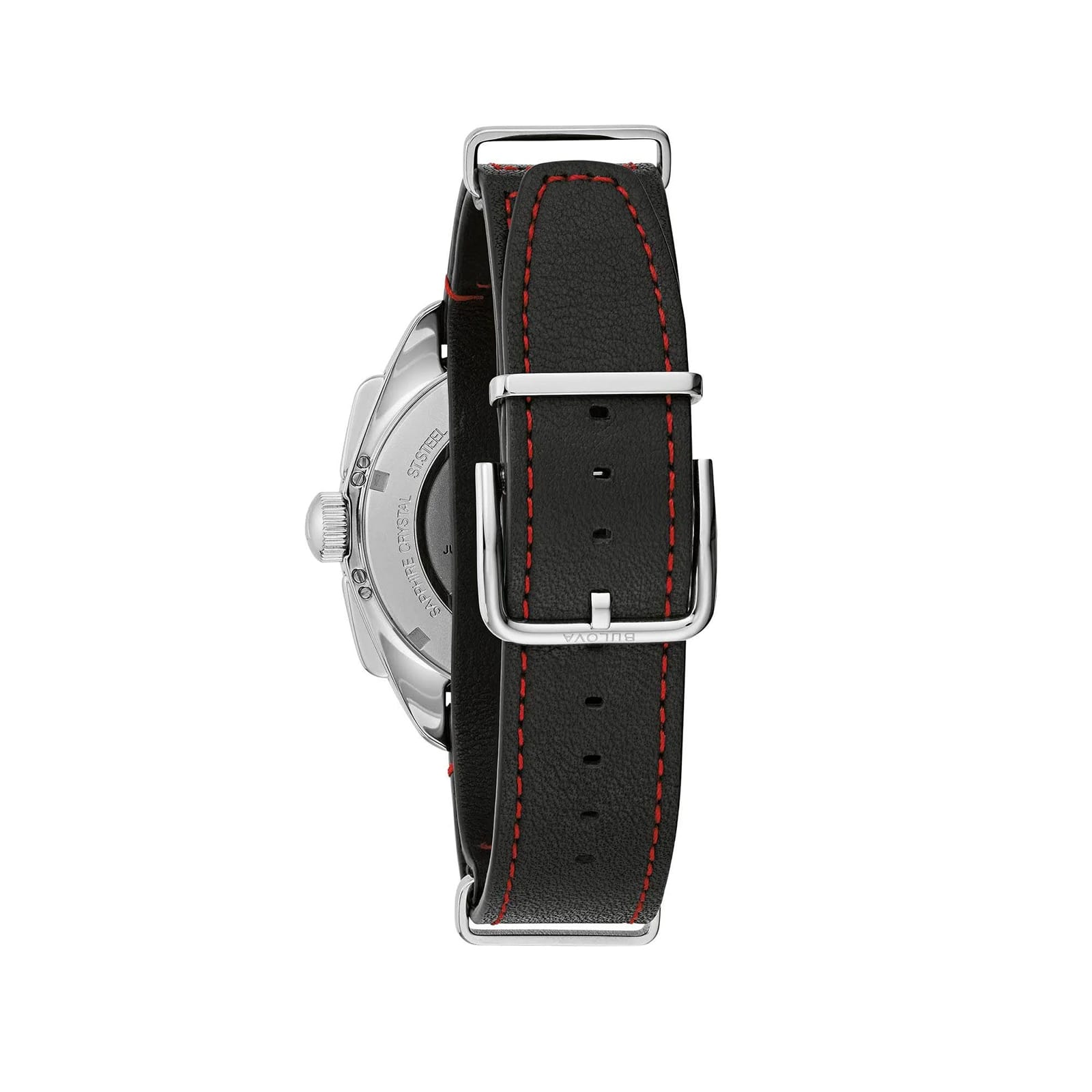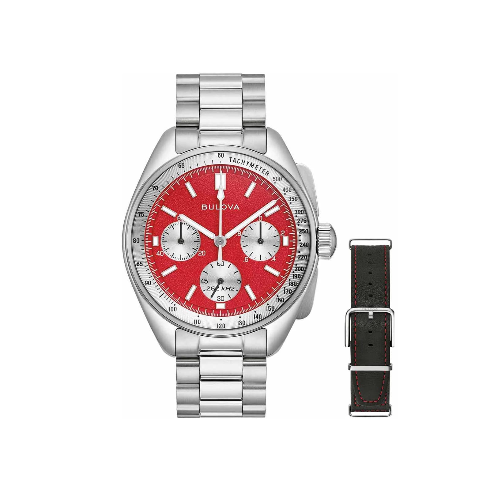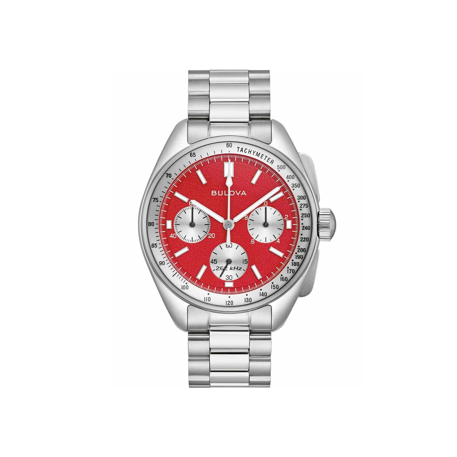 Ανδρικό ρολόι Bulova με μπρασελέ από ανοξείδωτο ατσάλι σε ασημί χρώμα και κόκκινο καντράν με χρονογράφους. Το ρολόι διαθέτει κρύσταλλο αχάρακτο ζαφειρίου και μηχανισμό υψηλής ακριβείας με συχνότητα στα 262kHz, ο οποίος είναι 8 φορές μεγαλύτερης ακριβείας από τους συνηθισμένους quartz μηχανισμούς.