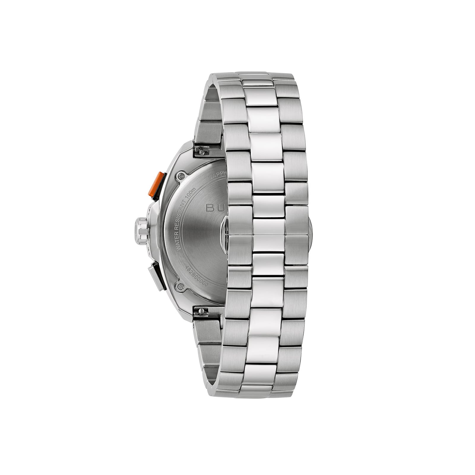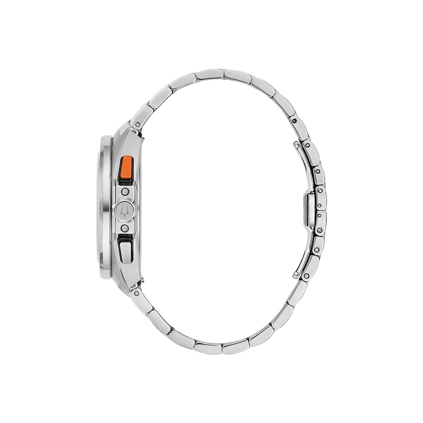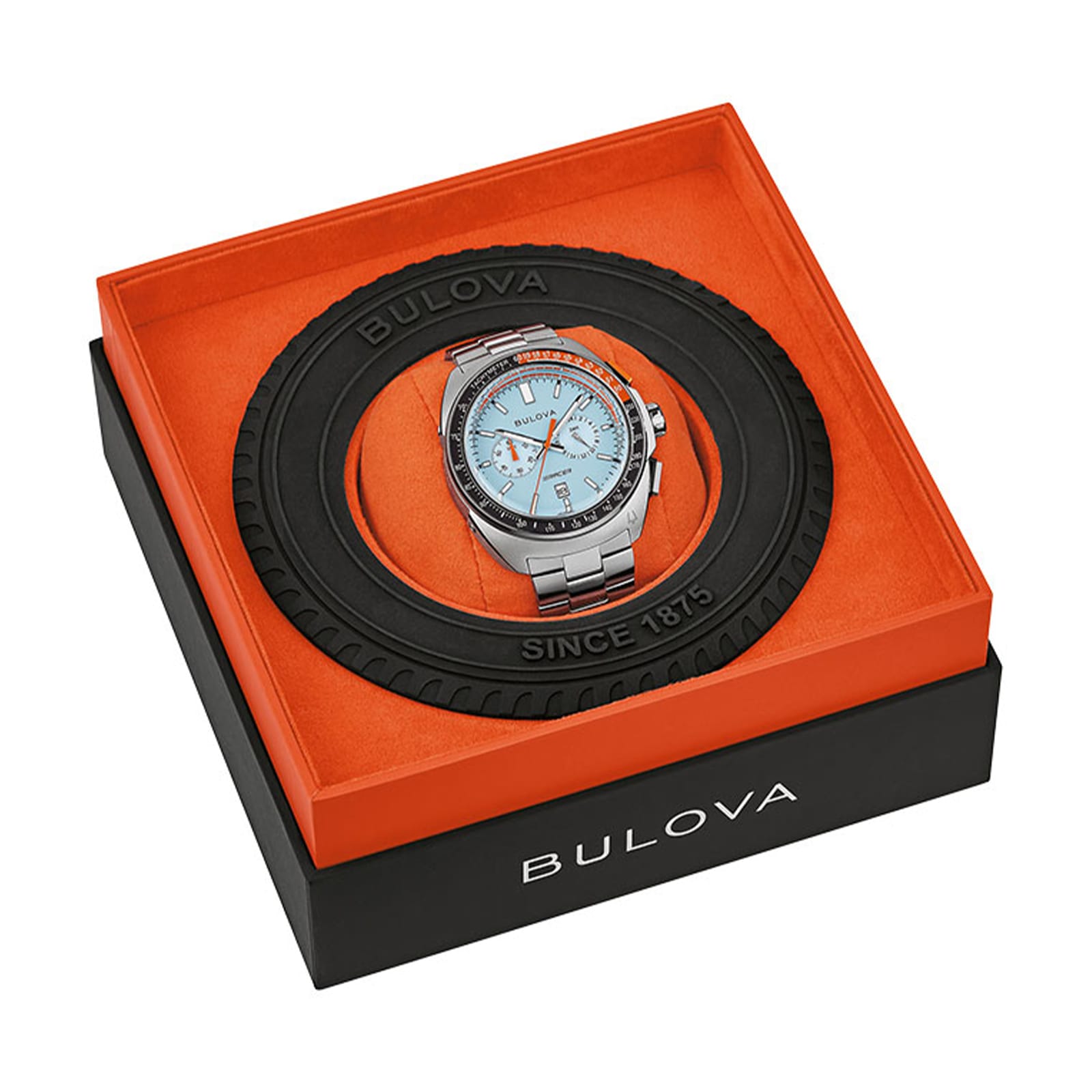 Ανδρικό ρολόι Bulova με μπρασελέ από ανοξείδωτο ατσάλι σε ασημί χρώμα, στεφάνη ταχυμέτρου σε μαύρο και πορτοκαλί χρώμα και ανοιχτό μπλε καντράν με χρονογράφους με ένδειξη ημερομηνίας και 24ώρου. Το ρολόι διαθέτει αχάρακτο κρύσταλλο ζαφειρίου και μηχανισμό quartz. Είτε κρατάτε το τιμόνι στην πίστα rally είτε στις καθημερινές σας μετακινήσεις, το ανδρικό Bulova Racer αποτελεί μια κομψή έκφραση της ιστορίας των αγώνων και του πάθους για ταχύτητα.