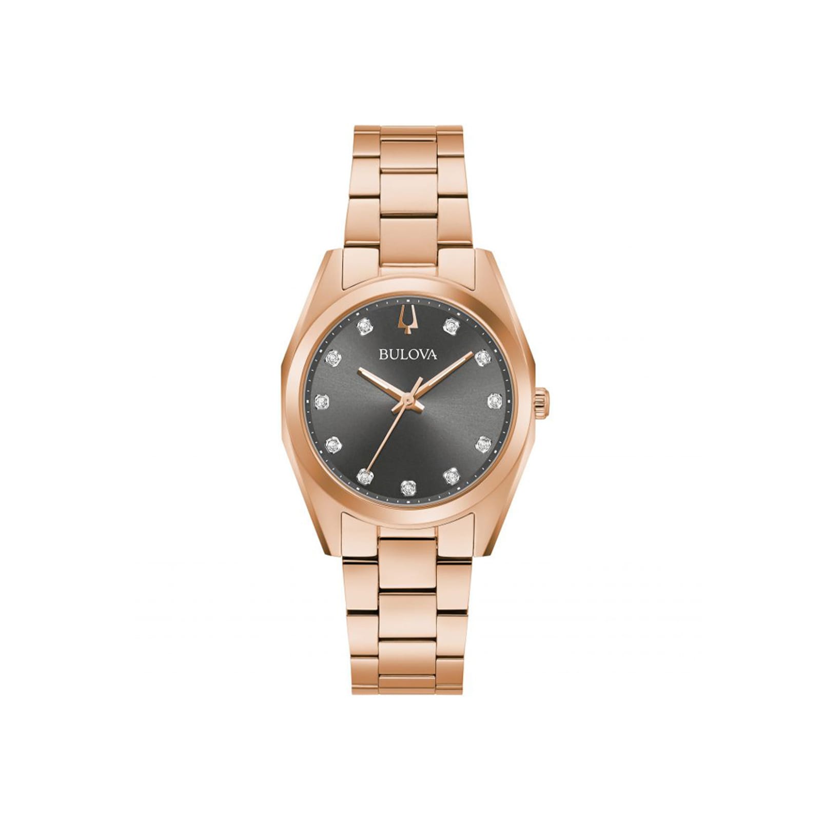 Γυναικείο ρολόι Bulova με μπρασελέ από ανοξείδωτο ατσάλι σε ροζ χρυσό χρώμα και γκρι καντράν με 11 διαμάντια. Το ρολόι διαθέτει ορυκτό κρύσταλλο ειδικής σκλήρυνσης και μηχανισμό quartz. Εντυπωσιακό με την κομψότητά του, αυτό το γυναικείο ρολόι Bulova είναι ιδανικός σύντροφος σε κάθε καρπό.