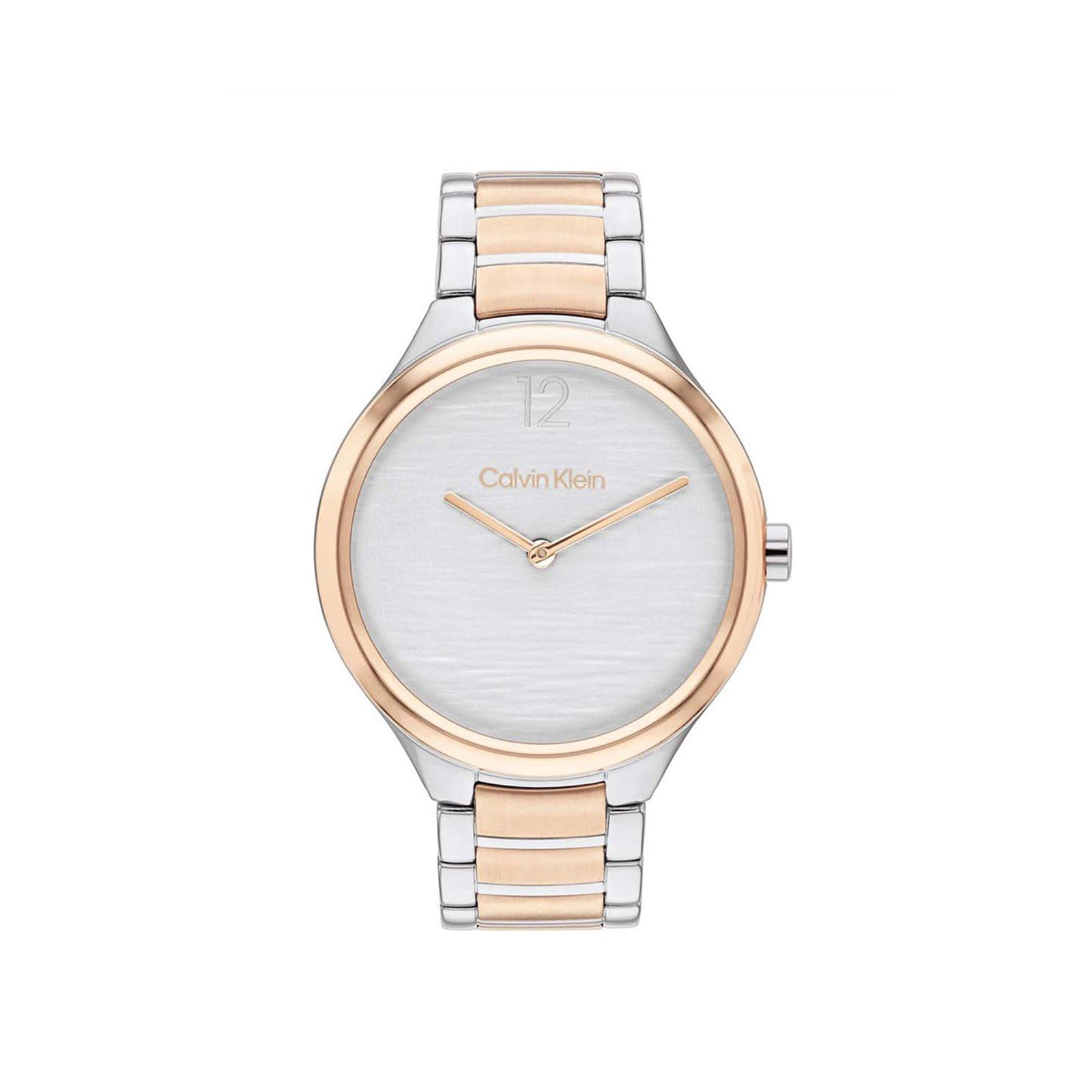 Γυναικείο ρολόι Calvin Klein με δίχρωμο μπρασελέ από ανοξείδωτο ατσάλι σε ασημί και ροζ χρυσό χρώμα, ροζ χρυσή κάσα και ασημί καντράν. Το ρολόι διαθέτει ορυκτό κρύσταλλο ειδικής σκλήρυνσης και μηχανισμό quartz.