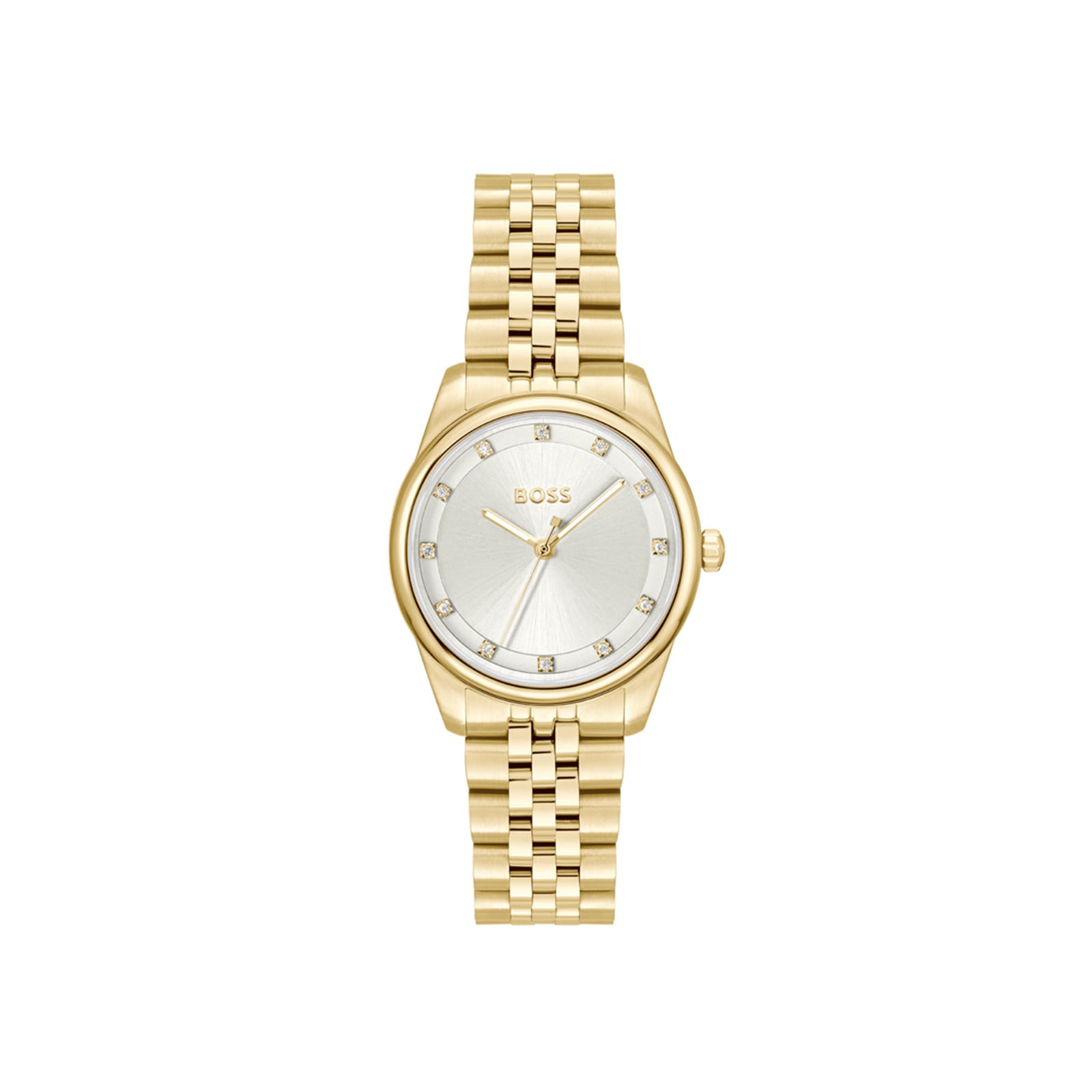 Γυναικείο ρολόι Boss με μπρασελέ από ανοξείδωτο ατσάλι σε χρυσό χρώμα και ασημί καντράν με πέτρες. Το ρολόι διαθέτει ορυκτό κρύσταλλο ειδικής σκλήρυνσης και μηχανισμό quartz.