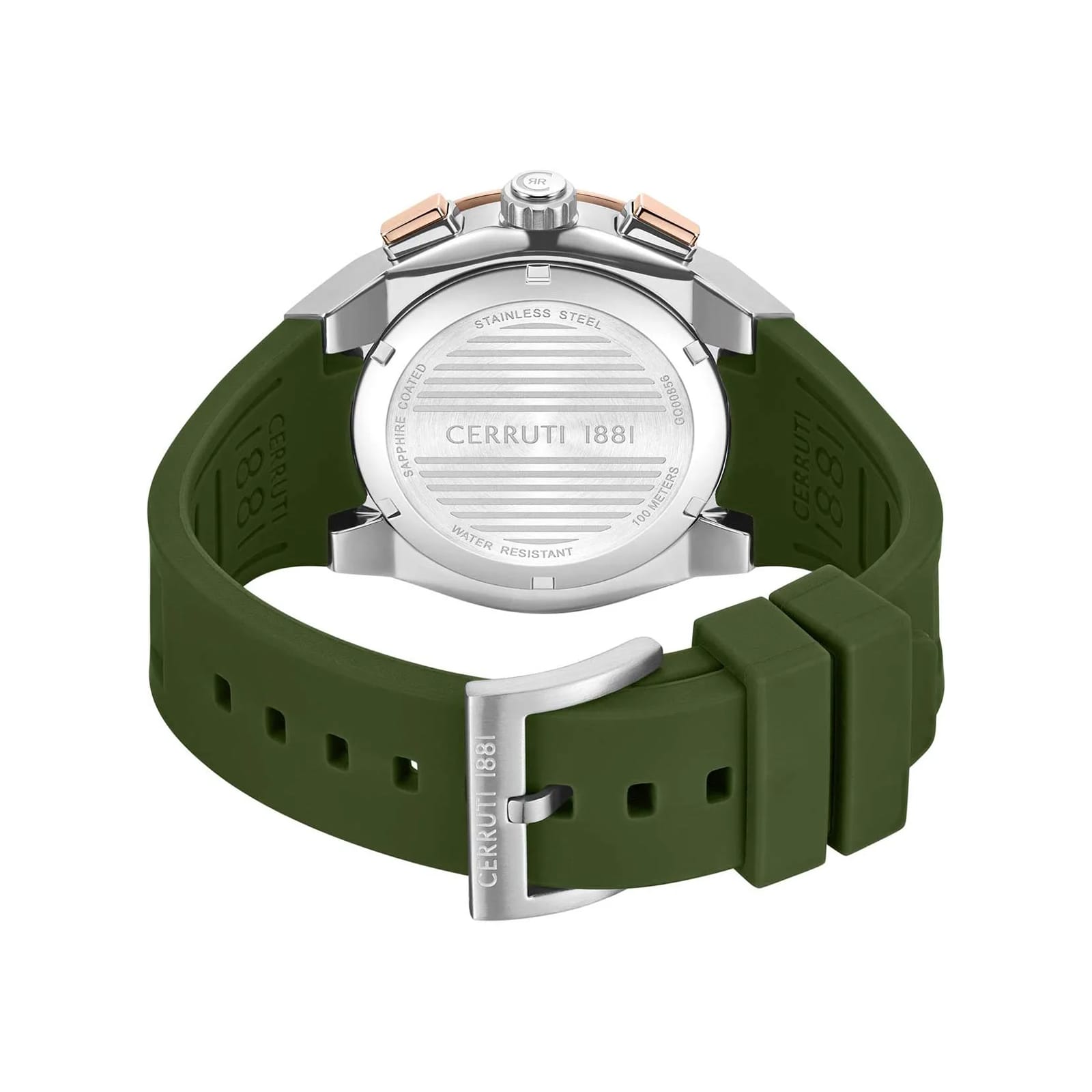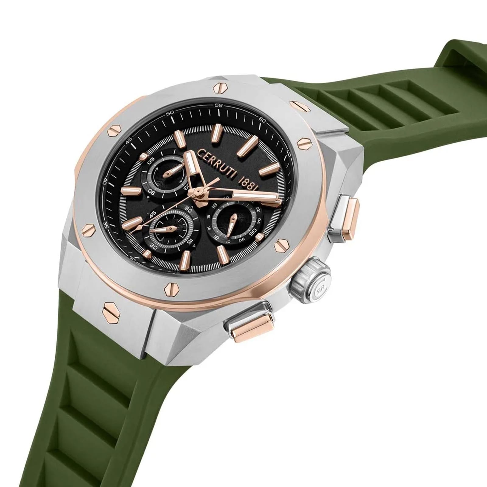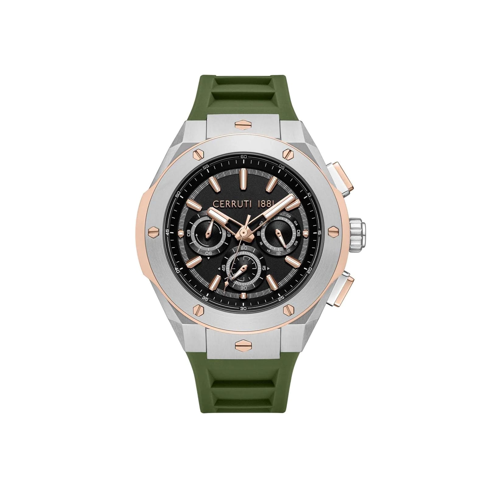 Ανδρικό ρολόι Cerruti 1881 με λουρί από καουτσούκ σε λαδί χρώμα και μαύρο καντράν με χρονογράφους και ροζ χρυσές λεπτομέρειες. Το ρολόι διαθέτει ορυκτό κρύσταλλο ειδικής σκλήρυνσης και μηχανισμό quartz.