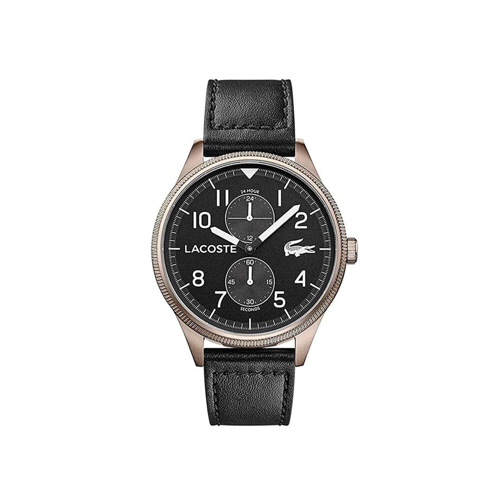 Ανδρικό ρολόι Lacoste από ανοξείδωτο ατσάλι με δερμάτινο λουρί σε μαύρο χρώμα, ροζ χρυσή κάσα και μαύρο καντράν με ένδειξη των δευτερολέπτων και του 24ώρου. Το ρολόι διαθέτει ορυκτό κρύσταλλο ειδικής σκλήρυνσης και μηχανισμό quartz.