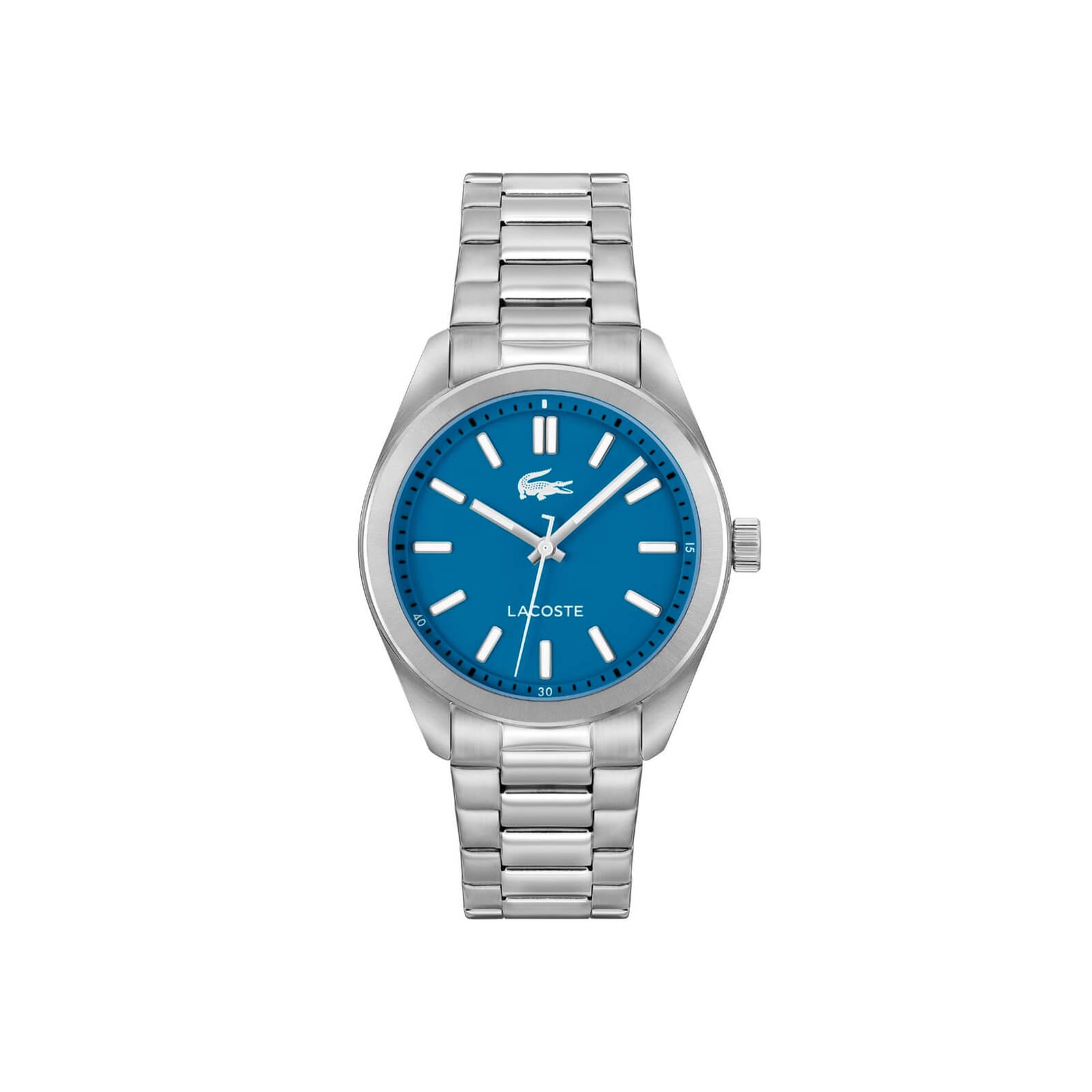 Ανδρικό ρολόι Lacoste από ανοξείδωτο ατσάλι με μπρασελέ σε ασημί χρώμα και μπλε καντράν με άσπρες λεπτομέρειες. Το ρολόι διαθέτει ορυκτό κρύσταλλο ειδικής σκλήρυνσης και μηχανισμό quartz.